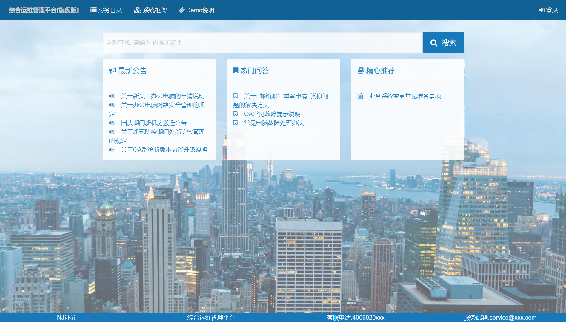 服務(wù)門戶作為信息中心的形象窗口,提供常見的公共運(yùn)維信息。首先是運(yùn)維服務(wù)目錄,公眾用戶可以快速了解信息中心的運(yùn)維職能和服務(wù)范圍;其次方便公眾瀏覽與查詢即時(shí)公告與熱門問答等日常信息,包含最新的運(yùn)維公告、熱門問答(FAQ)以及推薦知識(shí)等,公眾還可以通過輸入關(guān)鍵字進(jìn)行相關(guān)內(nèi)容的搜索。