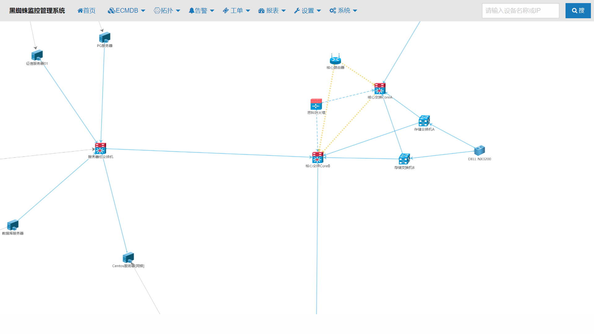 自動發(fā)現(xiàn)網(wǎng)絡(luò)拓?fù)洌晌锢硗負(fù)鋱D,動態(tài)展現(xiàn)資源的結(jié)構(gòu)分布、鏈路關(guān)系、性能指標(biāo)和運行狀態(tài)等,通過顏色策略、動態(tài)流量、告警提示變化來表示每個資源的異常等級,做到故障快速定位。